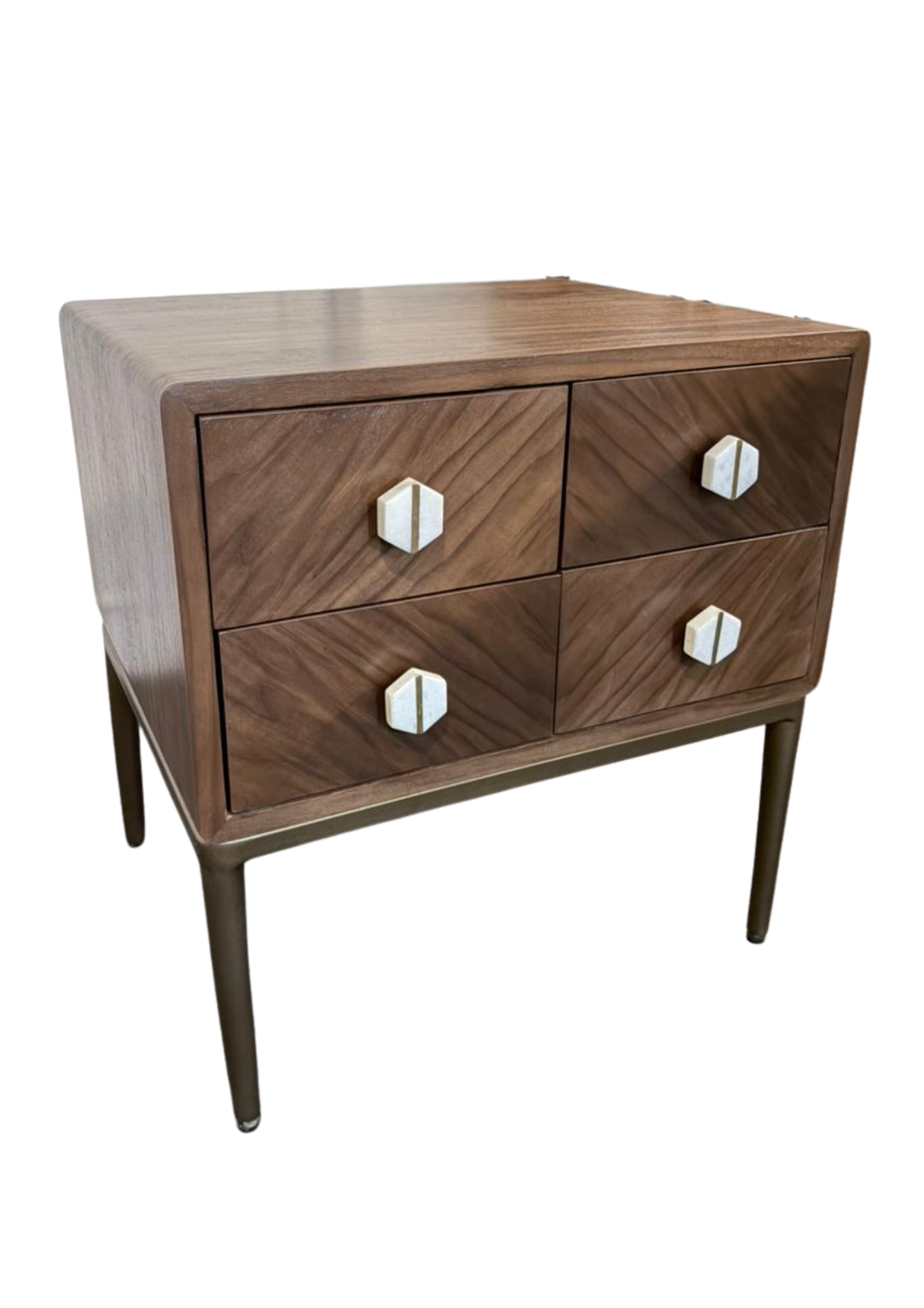 Solid wood structure with pull-out drawers in veneer laminated finish with metal legs/base in brass finish with stone handles